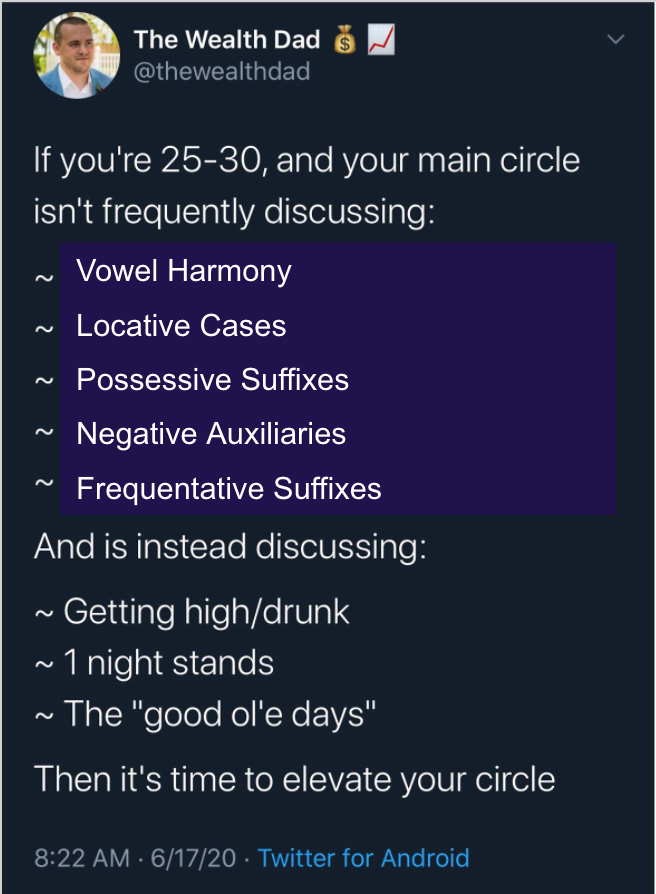 class: center, middle .mw40[] <!-- .wug[] --> # Morphology Ponrawee Prasertsom .g[LOT Training Camp 2025] --- # Me **Ponrawee Prasertsom .g[.ipa[\[pʰonráwiː pràsɤ̀ːtsǒm\]]]** - PhD student, Centre for Language Evolution, University of Edinburgh --- # Morpheme - Morphology is the study of words and their structures - Words in languages are formed by combining .t[morphemes] - Morphemes are the *smallest meaningful* units. - These are all morphemes: - .ex[ไก่] .lg[(Thai)] - .ex[pig] .lg[(English)] - .ex[re-] .lg[(English)] - .ex[=ni/に] .lg[(Japanese)] - .ex[jan/जन्] .lg[(Sanskrit)] --- # Morpheme-to-word ratio - Isolating = Low ratio ~ 1:1 .lg[(Thai)] <div data-gloss> <p>ฉัน อยาก จะ ไป เที่ยว</p> <p>1SG want IRR go travel</p> <p>‘I want to travel.’</p> </div> - Synthetic = Mid-range ratio .lg[(Japanese)] <div data-gloss> <p>Tarou-tachi=wa gohan=o tabe-mashita</p> <p>Taro-ASSOC=TOP rice=ACC eat-POLITE:PFV </p> <p>‘Taro and his group ate rice.'</p> </div> - Polysynthetic = High ratio .lg[(Central Yup’ik)] ← IOL loves this type. <div data-gloss> <p>tuntu-ssur-qatar-ni-ksaite-ngqiggte-uq</p> <p>reindeer-hunt-FUT-say-NEG-again-3SG.IND</p> <p>‘He had not yet said again that he was going to hunt reindeer.’</p> </div> --- # Making words from morphemes - Affixation - Prefix: .ex[⟨me-⟩muni] .g[.sm[.sc[1pl.excl.subj]-drink ‘(We) drink.’]] .lg[(Lewo)] - Suffix: .ex[lil⟨-its⟩] .g[.sm[cry-.sc[caus] ‘make (sb) cry.’]] .lg[(Chichewa)] - Circumfix: .ex[ke-⟩besar⟨-an] .g[.sm[.sc[nmlz]-huge-.sc[nmlz] ‘hugeness’]] .lg[(Malay)] - Infix: .ex[k⟨-amn-⟩aət] .g[.sm[born:.sc[nmlz] ‘birth’ ]] .lg[(Khmer)] - Compounding: .ex[demir] .g[.sm[road]] + .ex[yol-u] .g[.sm[iron-.sc[poss]]] → .ex[demiryolu] .g[.sm[‘railway (lit. road of iron)’]] .lg[(Turkish)] - Base modification: .ex[káʔba] .g[.sm[‘filth’]] → .ex[káʔbá] .g[.sm[filth:.sc[adjlz] ‘filthy’]] .lg[(Chalcatongo Mictec)] - Reduplication - Full reduplication: .ex[แดง] → .ex[แดงๆ] .g[.sm[‘kind of red’]] .lg[(Thai)] - Partial reduplication: .ex[kuk] → .ex[k**uk**-**uk**] .g[.sm[bark-.sc[prog] ‘be barking’]] .lg[(Mangap-Mbula)] - ‘‘Duplifix’’: .ex[jid] → .ex[ji**d**-a**d**] .g[.sm[street-.sc[pl] ‘streets’]] .lg[(Somali)] ??? Languages have many ways to build words out of morphemes. --- # Discontinuous morphology - Morphemes are usually combined in a (superficially) linear fashion. - .ex[nat-] .g[(root)] → .ex[nat-ion] → .ex[nat-ion-al] → .ex[nat-ion-al-ity] → .ex[nat-ion-al-iti-es] .lg[(English)] - ... But Semitic languages such as Arabic, Amharic, Hebrew and Maltese have .t[consonantal roots] (usually 3) and .t[transfixes]. Examples from Arabic: - .ex[**k**a**t**a**b**a] ‘he wrote.’ - .ex[**k**a**t**a**b**at] ‘she wrote.’ - .ex[ya**kt**u**b**u] ‘he writes.’ - .ex[ta**kt**u**b**u] ‘she writes.’ - .ex[**k**i**t**aa**b**] ‘book’ - .ex[**k**aa**t**i**b**] ‘writer (masculine)’ - .ex[**k**aa**t**i**b**at] ‘writer (feminine)’ --- # IOL 2003, Problem 2: Arabic Arithmetic .container[ .left-col[ .ipa[*tumn* + *tumnēn* = *talatt itmān* *sabaʕt itlāt* + *suds* = *ʕašart irbāʕ* *tusʕēn* + *tusʕ* = *sudsēn* *xamast ixmās* + *subʕ* = *tamant isbāʕ* *subʕēn* + *xumsēn* = `\(\frac{24}{35}\)` ] .d8em[All words and sums are fractions. Words and sums' numerators and denominators ≤ 10 and there is no `\(\frac{x}{1}\)`. ] ] ] --- # IOL 2003, Problem 2: Arabic Arithmetic .container[ .left-col[ .ipa[*___t___u___mn___* + *___t___u___mn___ēn* = *___t___a___l___a___t___t i___tm___ā___n___* *___s___a___b___a___ʕ___t i___tl___ā___t___* + *___s___u___ds___* = *___ʕ___a___š___a___r___t i___rb___ā___ʕ___* *___t___u___sʕ___ēn* + *___t___u___sʕ___* = *___s___u___ds___ēn* *___x___a___m___a___s___t i___xm___ā___s___* + *___s___u___bʕ___* = *___t___a___m___a___n___t i___sb___ā___ʕ___* *___s___u___bʕ___ēn* + *___x___u___ms___ēn* = `\(\frac{24}{35}\)` ] .d8em[All words and sums are fractions. Words and sums' numerators and denominators ≤ 10 and there is no `\(\frac{x}{1}\)`. ] ] ] --- # IOL 2003, Problem 2: Arabic Arithmetic .container[ .left-col[ .ipa[*___t___u___mn___* + *___t___u___mn___ēn* = *___t___a___l___a___t___t i___tm___ā___n___* *___s___a___b___a___ʕ___t i___tl___ā___t___* + *___s___u___ds___* = *___ʕ___a___š___a___r___t i___rb___ā___ʕ___* *___t___u___sʕ___ēn* + *___t___u___sʕ___* = *___s___u___ds___ēn* *___x___a___m___a___s___t i___xm___ā___s___* + *___s___u___bʕ___* = *___t___a___m___a___n___t i___sb___ā___ʕ___* *___s___u___bʕ___ēn* + *___x___u___ms___ēn* = `\(\frac{24}{35}\)` ] .d8em[All words and sums are fractions. Words and sums' numerators and denominators ≤ 10 and there is no `\(\frac{x}{1}\)`. ] ] .right-col[ .container[ .left-col[ #### Roots .ipa[ 1. t-m-n 2. t-l-t 3. s-b-ʕ 4. s-d-s 5. ʕ-š-r 6. r-b-ʕ 7. t-s-ʕ 8. x-m-s ] ] .right-col[ #### Transfixes .ipa[ 1. Ø-u-Ø-Ø 2. Ø-u-Ø-ēn 3. Ø-a-a-t 4. i-Ø-ā-Ø ] ] ] ] ] --- # IOL 2003, Problem 2: Arabic Arithmetic .container[ .left-col[ .ipa[*tumn* + *tumnēn* = *talatt itmān* *sabaʕt itlāt* + *suds* = *ʕašart irbāʕ* *tusʕēn* + *tusʕ* = *sudsēn* *xamast ixmās* + *subʕ* = *tamant isbāʕ* ___subʕēn + xumsēn = `\(\frac{24}{35}\)`___ ] .d8em[All words and sums are fractions. **Words and sums' numerators and denominators ≤ 10 and there is no `\(\frac{x}{1}\)`.** ] ] .right-col[ All denoms ≤ 10 ∴ .ipa[subʕēn, xumsēn] denoms = 5 and 7. ∴ .ipa[{subʕēn, xumsēn}] = `{\(\frac{2}{5}\)`, `\(\frac{2}{7}\)}` ∴ .ipa[Ø-u-Ø-ēn] = `\(\frac{2}{\text{root}}\)` .ipa[{s-b-ʕ, x-m-s} = {5, 7}] ∴ Transfixes = `\(\frac{x}{\text{root}}\)` ] ] --- # IOL 2003, Problem 2: Arabic Arithmetic .container[ .left-col[ .ipa[*tumn* + *tumnēn* = *talatt itmān* *sabaʕt itlāt* + *suds* = *ʕašart irbāʕ* ___tusʕēn + tusʕ = sudsēn___ *xamast ixmās* + *subʕ* = *tamant i